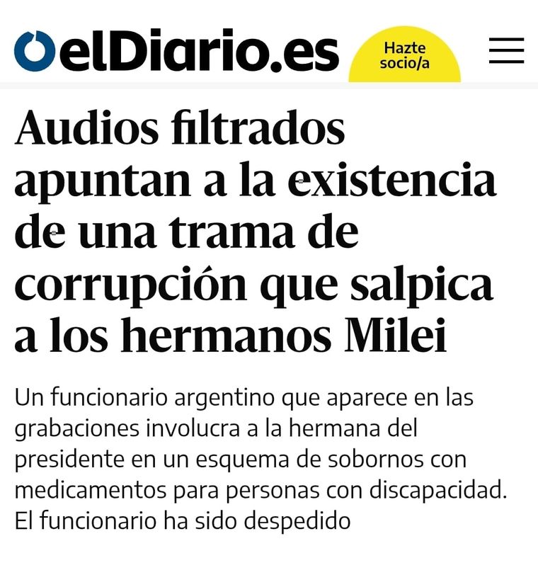 El Diario.Es apunta a que "Audios filtrados apuntan a la existencia de una trama de corrupción que salpica a los hermanos Milei". Y precisa que "un funcionario argentino que aparece en las grabaciones involucra a la hermana del presidente en un esquema de sobornos con medicamentos para personas con discapacidad".
