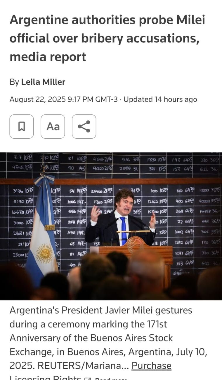 De la misma forma, Reuters lleva el titular "Autoridades argentinas investigan a funcionario de Milei por acusaciones de soborno" y destaca que, aunque la autenticidad de los audios aún no ha sido confirmada oficialmente, Spagnuolo afirma que informó al presidente sin recibir respuesta.