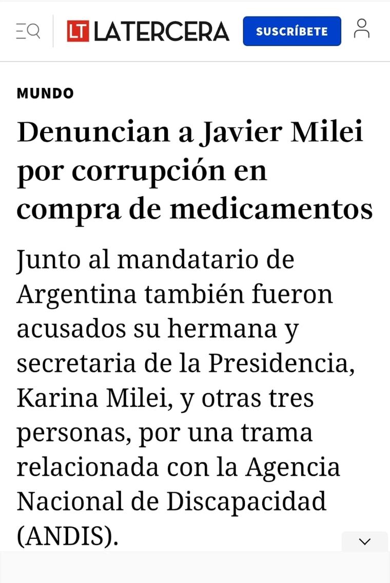 La Tercera de Chile, lleva por título: "Denuncian a Javier Milei por corrupción en compra de medicamentos". Refleja además que "junto al mandatario de Argentina también fueron acusados su hermana y secretaria de la Presidencia, Karina Milei, y otras tres personas, por una trama relacionada con la Agencia Nacional de Discapacidad (ANDIS)".