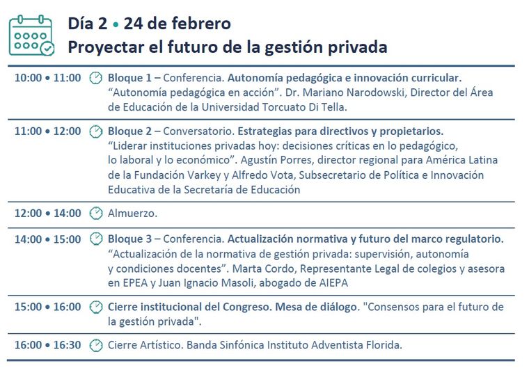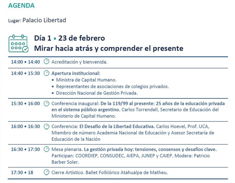 La primera jornada, el 23 de febrero, incluirá la apertura institucional y un recorrido por la historia de la educación privada, además de mesas plenarias enfocadas en los desafíos del presente. El 24 de febrero, en tanto, estará orientado a la proyección futura del sector, con conferencias y conversatorios sobre autonomía pedagógica, innovación curricular y actualización normativa.