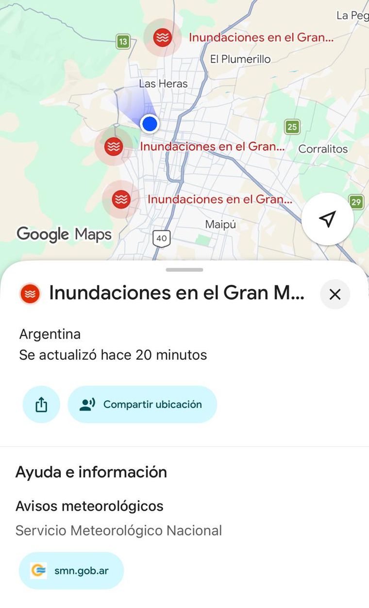 Junto a esto, si se hacía click sobre el alerta aparecía una ventana de Google Maps con distintos puntos en los que se reportaban inundaciones. Específicamente, en Las Heras y el oeste de Ciudad y Godoy Cruz.
