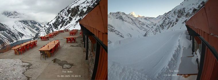 La primera fotografía, tomada el 15 de agosto, muestra la terraza del lugar con las mesas al aire libre y apenas un manto de nieve. En contraste, la segunda imagen, del 23 de agosto, revela el mismo espacio totalmente cubierto. La nieve sobrepasa la altura de las mesas y cubre por completo el área, dejando una postal de invierno inolvidable.