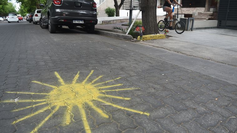 Sobre la calle, aparentemente en el lugar donde el adolescente perdió la vida, se puede ver la estremecedora imagen de un sol pintado también con aerosol amarillo.
