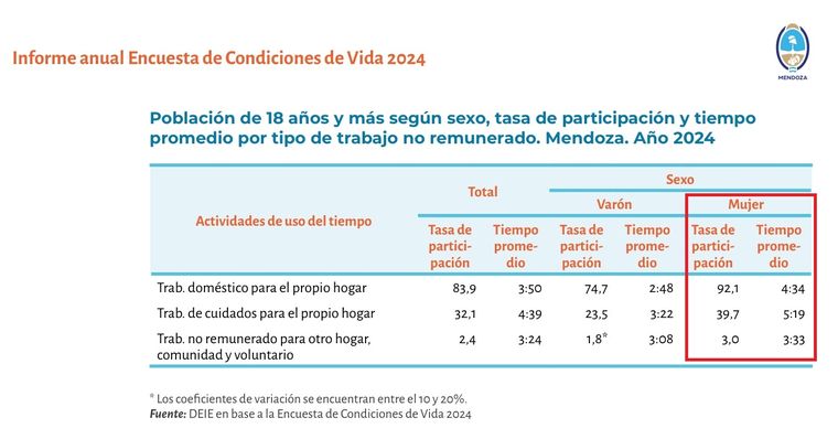 Según el mismo relevamiento, las mujeres en Mendoza realizan la mayor parte del trabajo no remunerado: limpieza, cuidado de niños, acompañamiento escolar, entre otros. Este esfuerzo invisible sigue siendo desvalorizado en términos económicos y simbólicos, aunque es el motor silencioso que permite que muchas familias se mantengan a flote.