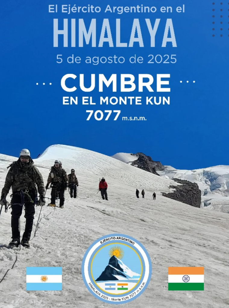 Instagram @ejercitoargEste martes 5 de agosto, una patrulla integrada por personal del Ejército Argentino y del Ejército de la India alcanzó la cima del Monte Kun, en la cordillera del Himalaya, a 7077 metros sobre el nivel del mar. El ascenso, concretado a las 00:15 (hora local), marcó uno de los hitos más relevantes de las tropas de montaña argentinas en el extranjero.