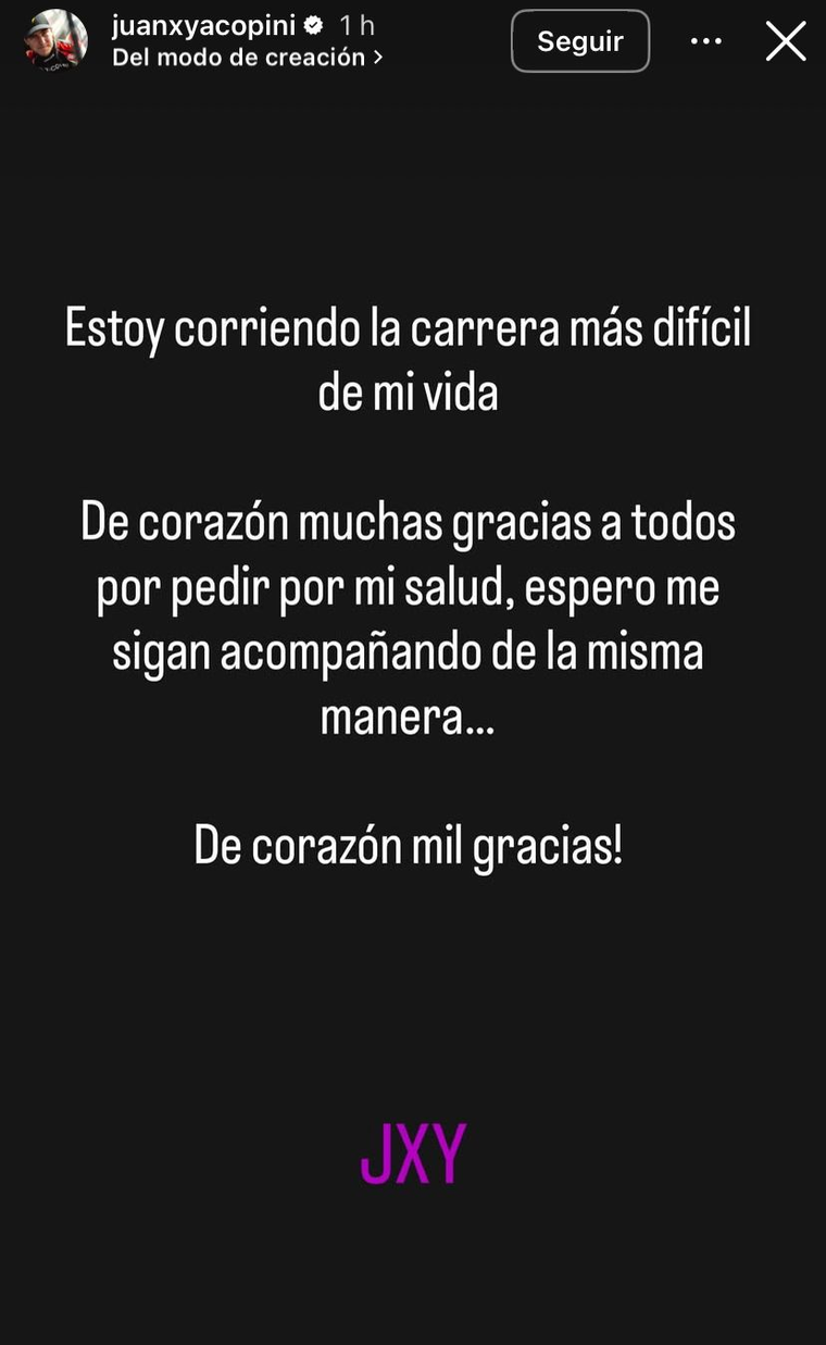 "Estoy corriendo la carrera más difícil de mi vida. De corazón muchas gracias a todos por pedir por mi salud, espero que me sigan acompañando de la misma manera. De corazón mil gracias", fue el posteo de Juan Cruz Yacopini en sus redes sociales.