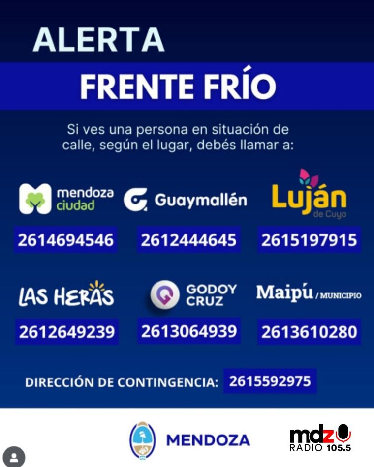 Mientras tanto, todos los ciudadanos de Mendoza pueden contribuir para evitar que las personas duerman en la vía pública. Se puede ayudar advirtiendo la presencia de personas en situación de calle a distintos números telefónicos por municipio. Son los siguientes: