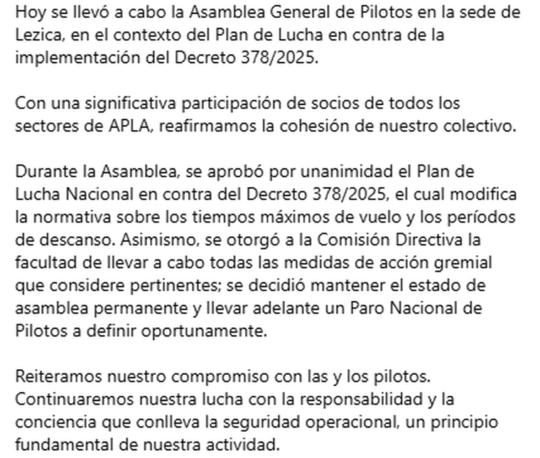 De acuerdo con lo contemplado en la Asamblea General en su sede de Lezica, la Comisión Directiva de APLA tendrá la potestad de implementar todas las medidas de acción gremial necesarias, incluyendo un paro nacional que será definido próximamente, como rechazo a las modificaciones de las regulaciones laborales de los pilotos.