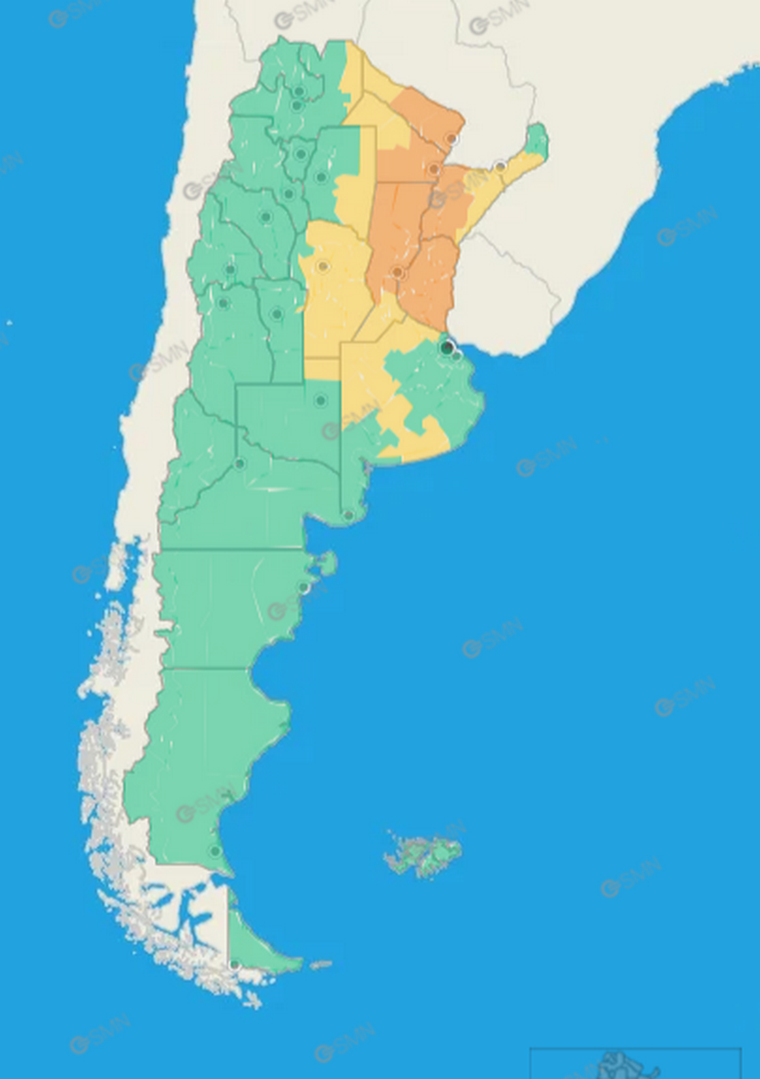 Las alertas de nivel de alerta naranja, que implica fenómenos meteorológicos más intensos, afectarán principalmente sectores del norte y noreste argentino. Las zonas más comprometidas se ubican en Chaco, norte de Santa Fe, noreste de Santiago del Estero, sectores de Corrientes y áreas del norte de Entre Ríos.