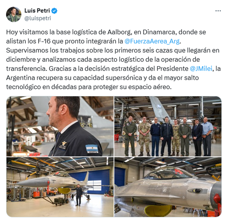 X @luispetriEste martes, el ministro de Defensa de la Nación, Luis Petri, compartió imágenes de su viaje a Dinamarca para supervisar los trabajos sobre los primeros seis aviones de combate F-16 que serán incorporados a la Fuerza Aérea Argentina.