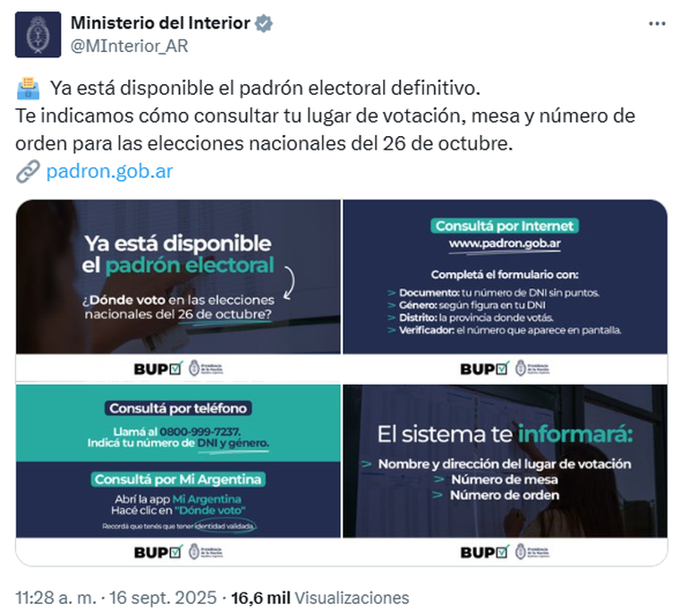 El Ministerio del Interior informó que ya está disponible el padrón electoral para las elecciones nacionales del 26 de octubre.