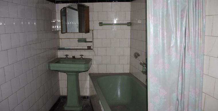 Uno de los baños antiguos conserva azulejos blancos y sanitarios de colores, típicos de su época.