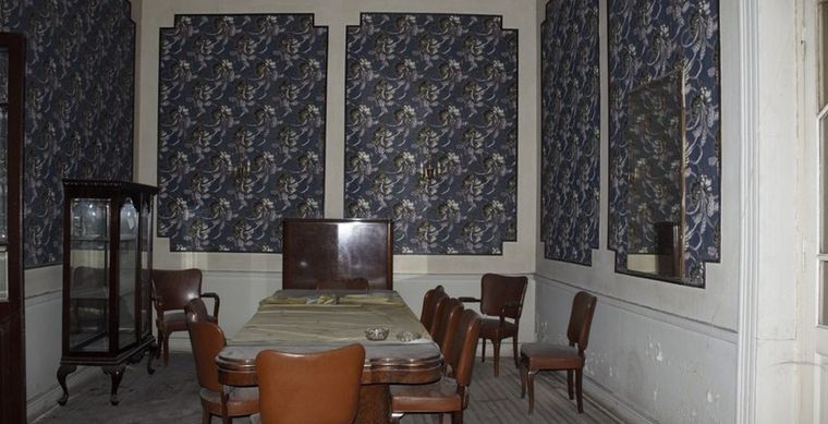 El comedor principal mantiene su mesa larga con las sillas originales y los tapizados florales que siguen intactos, a pesar del desgaste.