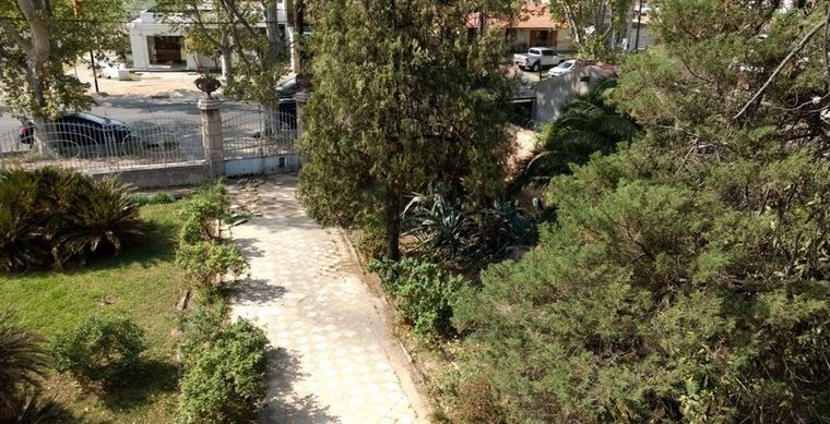 El jardín frontal muestra senderos de baldosas despejados hasta la entrada con un parquizado que los rodea luciendo pinos, arbustos, palmeras y una vegetación desbordada.