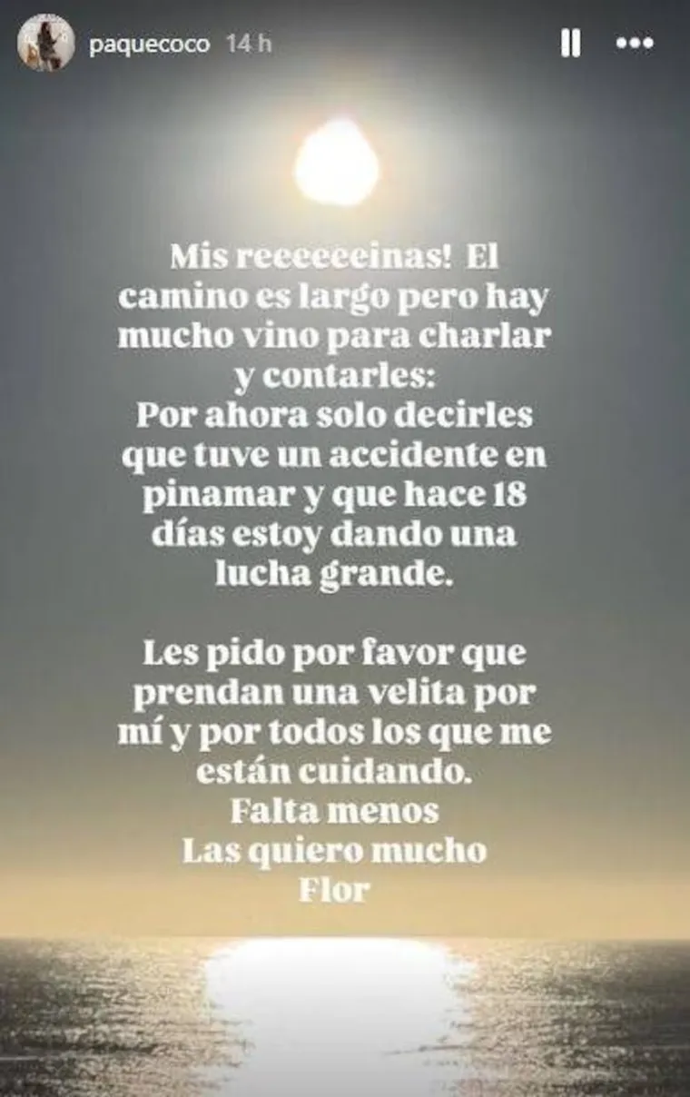 A través de una historia publicada en la cuenta oficial de su emprendimiento, Rastelli relató que atraviesa un momento difícil. “Por ahora solo decirles que tuve un accidente y que hace 18 días estoy dando una lucha grande”, escribió. En el mismo mensaje también pidió a sus seguidoras que la acompañen en este proceso: “Prendan una velita por mí y por todos los que me están cuidando”.
