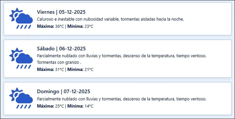 "Caluroso e inestable con nubosidad variable, tormentas aisladas hacia la noche. Precipitaciones en cordillera", detalló Contingencias Climáticas para este viernes en Mendoza. Por su parte, el Servicio Meteorológico Nacional agregó lo siguiente: “El área será afectada por lluvias y tormentas de variada intensidad, algunas localmente fuertes o puntualmente severas. Las mismas podrán estar acompañadas por granizo, frecuente actividad eléctrica, ráfagas de hasta 80 km/h y abundante caída de agua en períodos cortos. Se prevén valores diarios de precipitación acumulada entre 20 y 40 mm, que pueden ser superados en forma puntual”.