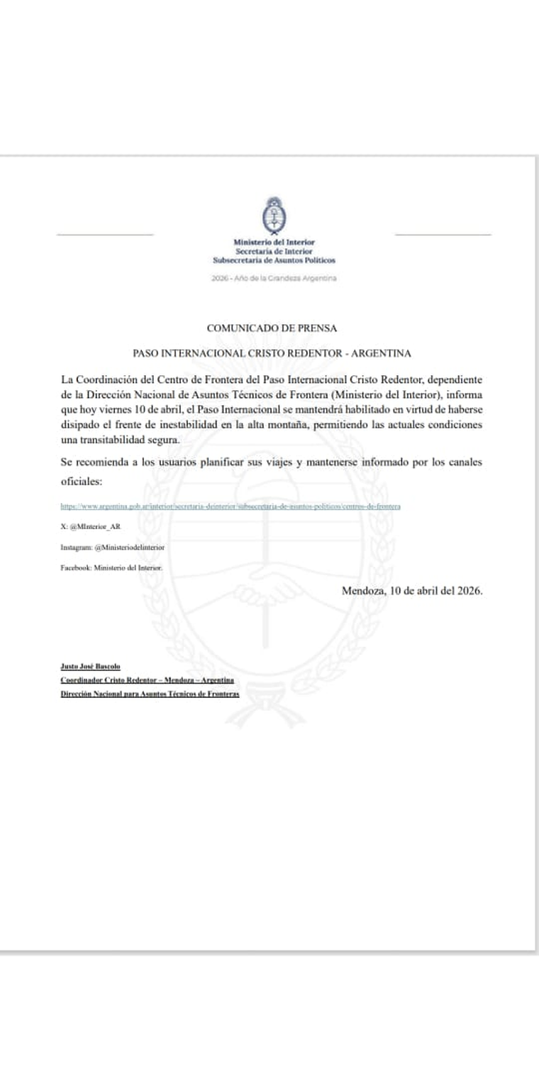 "La coordinación del centro de frontera del Paso Internacional Cristo Redentor, dependiente de la Dirección de Asuntos Técnicos de Frontera (Ministerio del Interior) informa que hoy viernes 10 de abril el paso se mantendrá habilitado en virtud de haberse disipado el frente de inestabilidad en la alta montaña, permitiendo las actuales condiciones una transitabilidad segura", informaron fuentes oficiales.