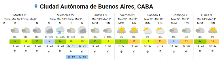 Para el miércoles, el SMN prevé chaparrones en las primeras horas del día, pero con una tendencia a la mejora hacia la tarde. No obstante, desde Meteored indicaron que hay entre 30% y 50% de probabilidades de lluvia débil desde las 20 horas del miércoles. En tanto, las temperaturas oscilarán entre los 9°C y los 18°C.