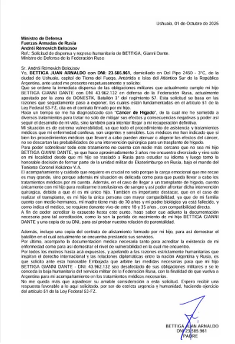 En su presentación ante las autoridades rusas, Juan Bettiga también anexó documentación médica personal. Padece cáncer de hígado, entre otros problemas de salud, situación que agrega un componente crítico al pedido de carácter humanitario. En la nota dirigida al ministro Beloúsov, el padre señala que la situación afecta directamente su integridad emocional y física.