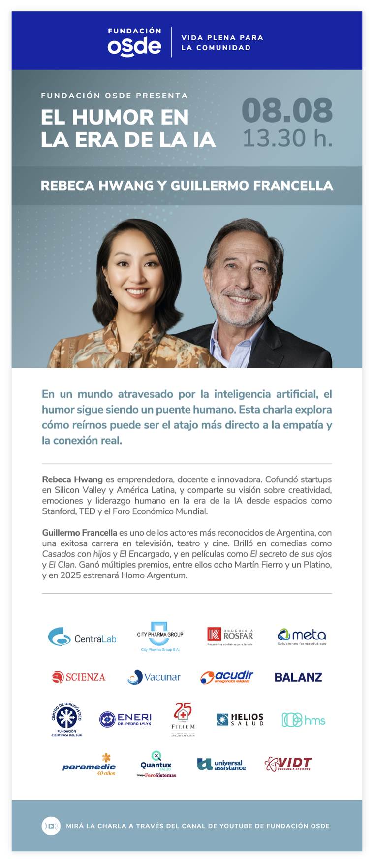 En el marco de su programa de actividades libres y gratuitas abiertas a toda la comunidad, Fundación OSDE invita a la charla que brindará Guillermo Francella, el famoso actor argentino, junto a Rebeca Hwang, experta en IA, denominada “El humor en la era de la IA”. Será el viernes 8 de agosto a las 13.30 y se podrá ver a través del canal de Youtube de Fundación OSDE.