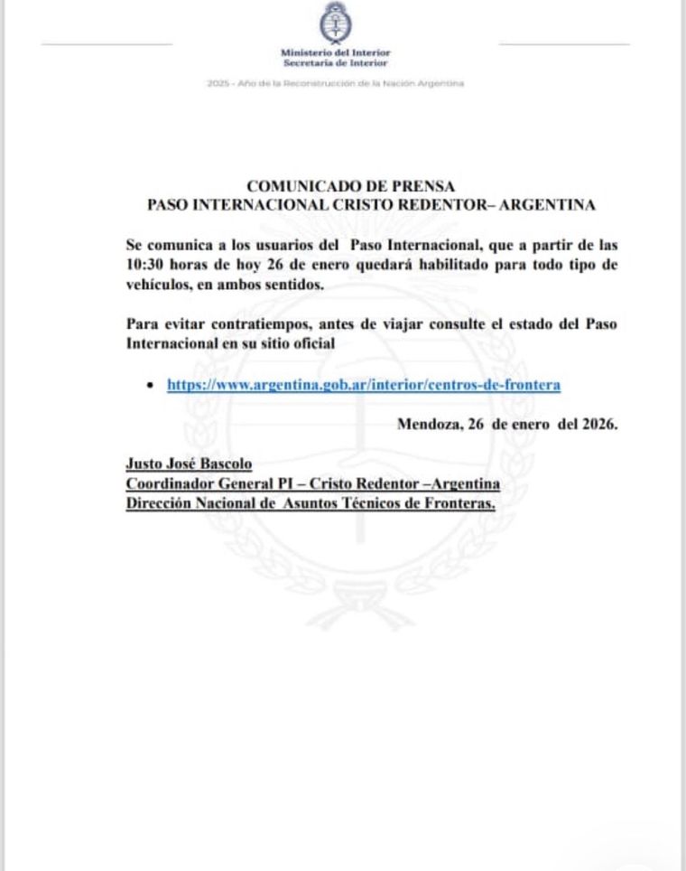El paso a Chile permanecía cerrado por mal tiempo desde el domingo por la noche. El comunicado oficial.