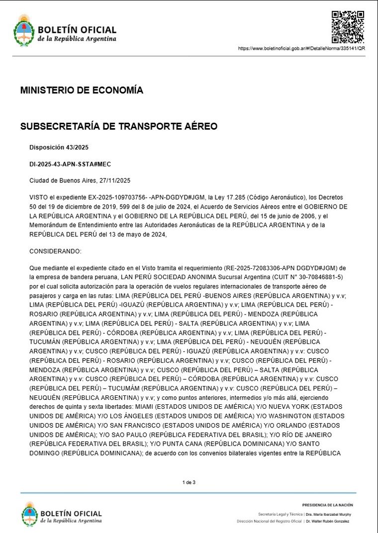 Esta resolución autoriza a la aerolínea de Perú a tener servicio de pasajeros y cargas en la ruta Lima-Mendoza y también Cusco-Mendoza. Esto es positivo para los mendocinos. La Disposición 43/2025 explica que la empresa cumple con los requisitos legales y administrativos que se encuentran previstos en el Código Aeronáutico. Además de Mendoza, el plan general incluye rutas desde Lima y Cusco hacia Buenos Aires, Córdoba, Rosario, Salta, Tucumán, Neuquén e Iguazú.