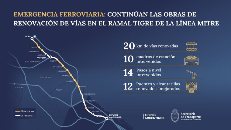 Entre el 10 de enero y el 28 de febrero, el ramal Tigre del tren Mitre permanecerá interrumpido por un período de 49 días consecutivos debido a obras consideradas esenciales para la seguridad y confiabilidad del servicio ferroviario. Los trabajos se enmarcan en la Emergencia Ferroviaria y son ejecutados por Trenes Argentinos Infraestructura.
