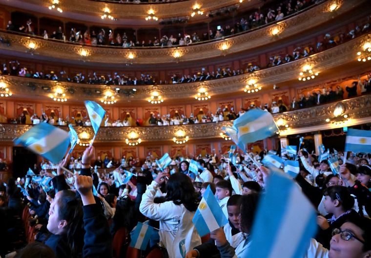Más de mil estudiantes de escuelas públicas y privadas participaron del acto por el Día de la Bandera, encabezado por Jorge Macri, en el mítico Teatro Colón.