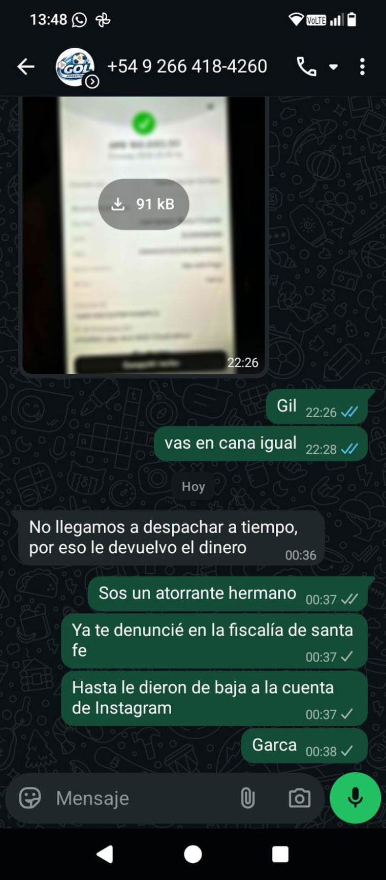 Félix, el sanjuanino, se pone en contacto por privado con su vecino de Mendoza. "Mirá lo que me llegó" junto a una captura de Mercado Pago. Le habían devuelvo los 150.000 pesos "invertidos". Al resto, al mendocino lo mismo y a Agustín, el cordobés, también. La excusa desde "Gol Argentino" fue "no pudimos cumplir con los pedidos, por eso devolvemos la plata". El estafador no tuvo más opción.