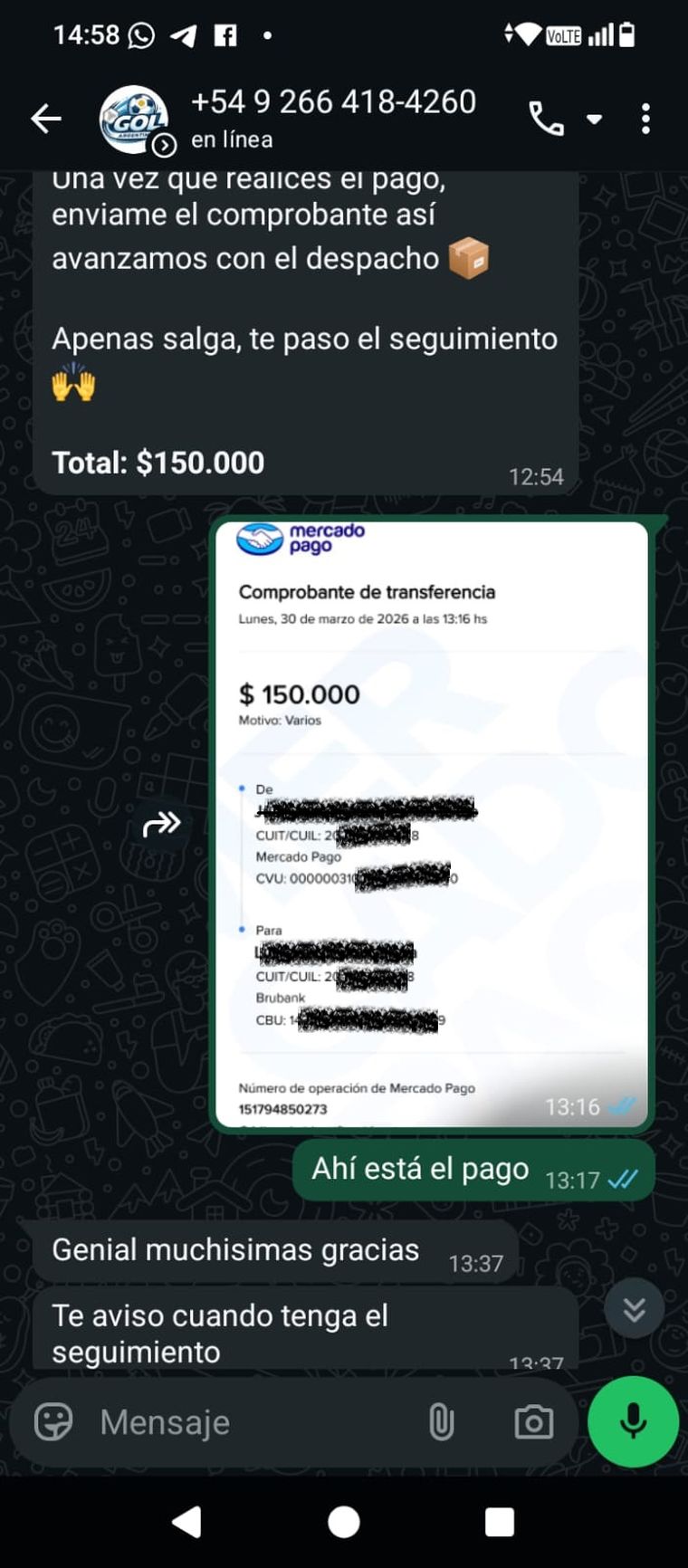 Ese "¿Estás seguro?" encendió las luces de alerta. En los 16 kilómetros que separan a Diego de la escuela de sus hijos, no paró de pensar en lo que había hecho. "¿Y si me estafaron?", una y otra vez. Antes de la salida del colegio, el comprador se volvió a comunicar con "Gol Argentino": "¿A qué hora más o menos creés que despachás el pedido?". Una media hora después llegó la respuesta: "Estoy esperando al cadete. No debe tardar más de 20 minutos en llegar".