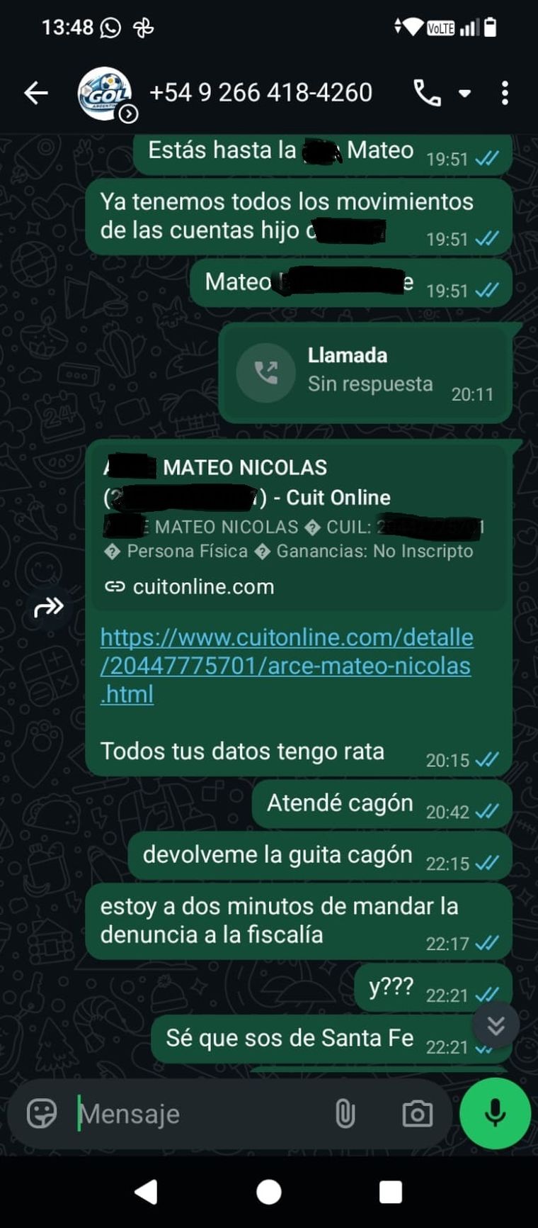A la par, un bombardeo preciso al número de WhatsApp de "Gol Argentino". "Tengo todos tus datos. Pude acceder a la cuenta. Devolveme la plata Mateo XXX. Sé que no sos de San Luis, sino de Santa Fe", y así una interminable lista de mensajes y una presión constante del grupo de "estafados", uno de San Juan y el otro de Córdoba, quienes triangulaban información en un grupo de mensajería creado para la ocasión.