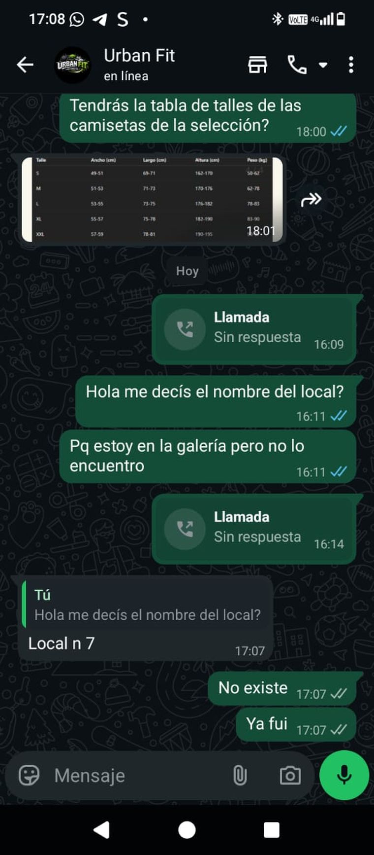 A la par, el comprador, a más de mil kilómetros de distancia, volvió a escribir al número de WhatsApp de "Urban Fit". "Hola estoy en el lugar, pero no encuentro el local", escribió con la esperanza de que la premonición de su amigo fuese solo eso y que la compra se pudiese concretar cuanto antes.