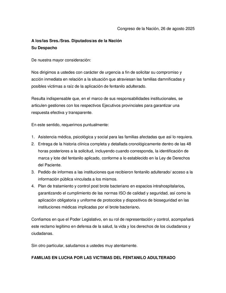 “Nos dirigimos a ustedes con carácter de urgencia a fin de solicitar su compromiso y acción inmediata en relación a la situación que atraviesan las familias damnificadas y posibles víctimas a raíz de la aplicación de fentanilo adulterado”, señala el documento.