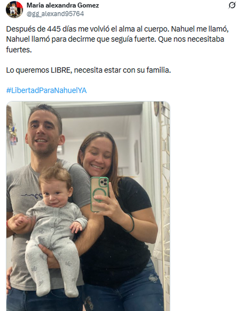 Luego de esta primera comunicación en más de un año, María Alexandra publicó en su cuenta de X: "Después de 445 días, me volvió el alma al cuerpo. Nahuel me llamó para decirme que seguía fuerte. Que nos necesitaba fuertes". Al respecto, manifestó: "Lo queremos LIBRE, necesita estar con su familia".