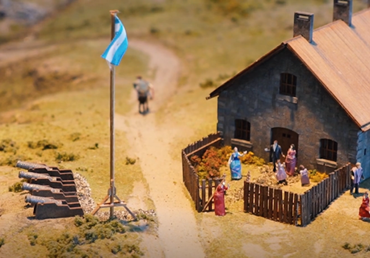 Bueno, este es el primer piso del museo, es el sector que muestra la etapa argentina después de 1810. Y un poco lo que busca esta maqueta es mostrarle al público que no es como dicen los británicos que Puerto Luis, que es donde estaba Vernet, era un lugar donde simplemente se reabastecían los buques loberos o balleneros, sino que era un lugar institucional. El gobierno de la provincia de Buenos Aires lo designa a Vernet como gobernador. Había una comandancia, había cañones, se cobraban impuestos.