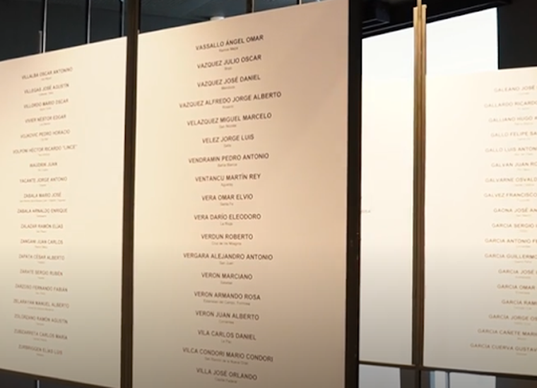 Uno de los sectores que con las chicas de museología empezamos a trabajar en esta gestión es lo que antes se llamaba la sala de los caídos, que tenía unas tablets donde iban intercambiándose las fotos de los caídos y un fondo con proyector donde se mostraba el cementerio de Darwin. Nosotros decidimos llamarlo la sala de los héroes en honor a estos héroes de la patria, que son nuestros caídos en combate. Y un poco lo que estamos mostrando es, si vos ves en las columnas están los nombres de cada uno para que el público mientras estamos en obra sepa quiénes son.
