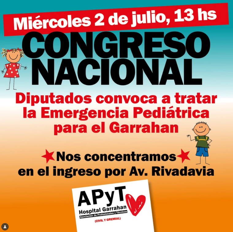 Este mismo miércoles, mientras se espera que se debata en la Cámara de Diputados del Congreso de la Nación la Ley de Emergencia en Salud Pediátrica del Garrahab, desde el gremio APyT del nosocomio anunciaron la realización de dos nuevos paros generales este mes. De acuerdo con lo informado, la medida de fuerza se llevará a cabo el 10 y el 17 de julio, convocando, además, a una movilización masiva federal.