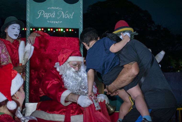 Uno de los momentos más esperados de la noche fue la llegada de Papá Noel, que convocó a cientos de niños y familias. La fila para saludarlo y tomarse fotos se extendió desde la fuente hasta el sector del Teatro Quintanilla, con más de 500 personas participando de una experiencia.