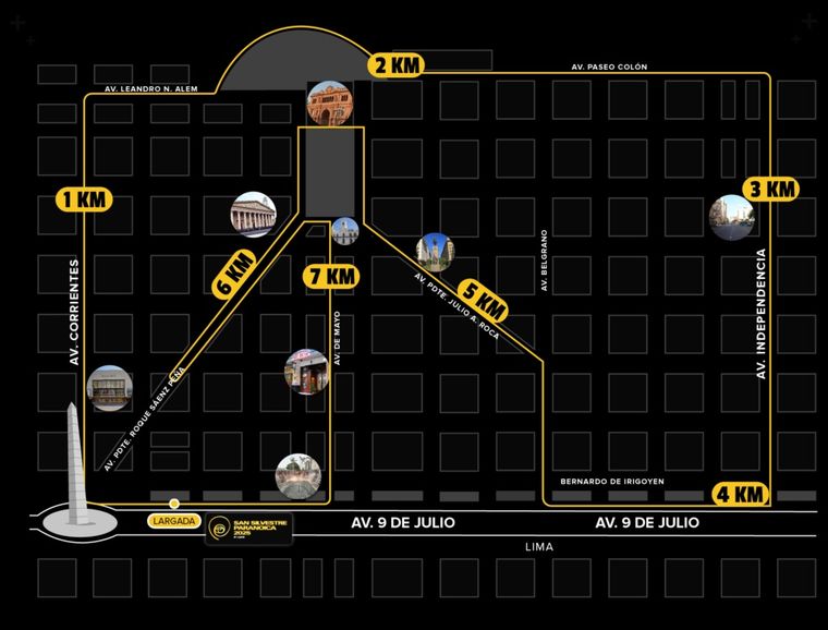 El circuito comenzó a metros del Obelisco y recorrió la Avenida de Mayo, la Avenida Presidente Roque Sáenz Peña hasta Plaza de Mayo y Casa Rosada, continuó por Avenida Julio Roca y Avenida Belgrano hasta 9 de Julio. Luego siguió por Avenida Independencia hasta Paseo Colón y Avenida Leandro N. Alem, para finalmente retomar la Avenida Corrientes y regresar al punto de partida.