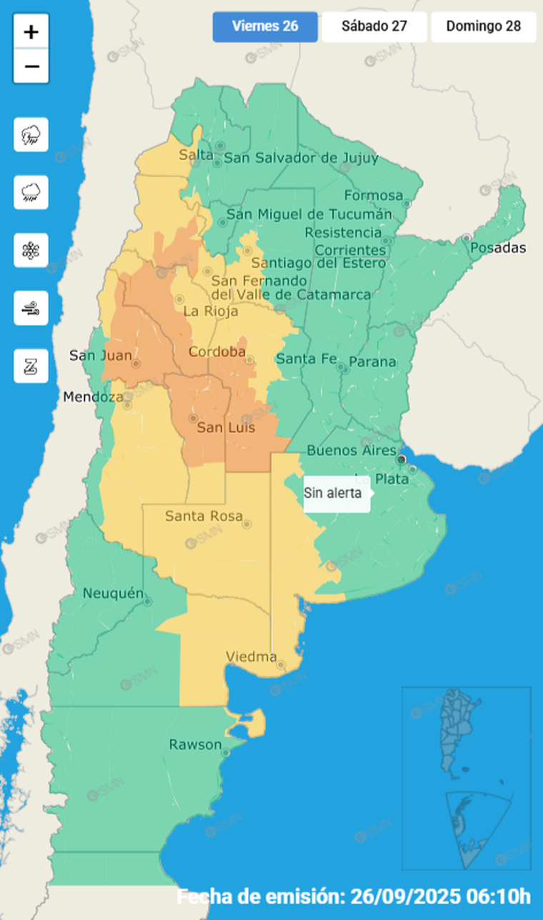Según informó el Servicio Meteorológico Nacional, hasta el momento se ha reportado la alerta amarilla por viento y lluvias en la región centro, norte y sur del país, precisamente para Buenos Aires, Río Negro, Chubut, Santa Cruz, La Pampa, Córdoba, San Luis, Mendoza, San Juan, La Rioja y Catamarca.