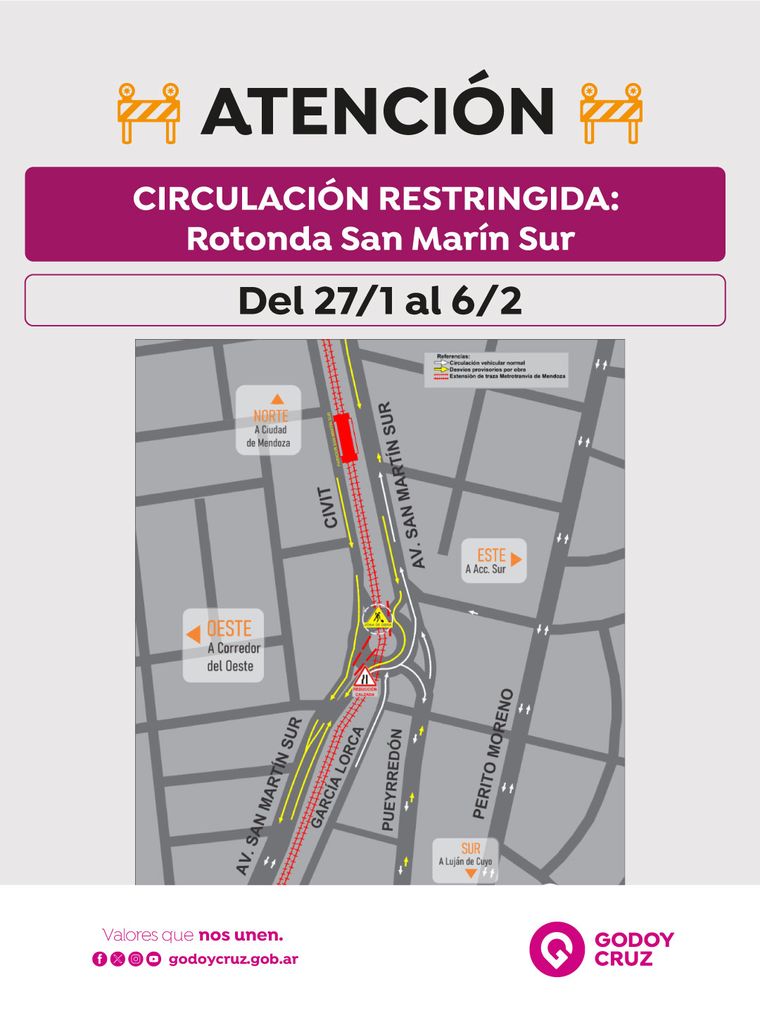 Entonces, quienes vengan por la arteria principal desde el Norte en dirección a Luján de Cuyo, verán cortada la circulación. Para continuar, deberán hacerlo con cuidado por la vía contraria de la rotonda, informaron desde el municipio.