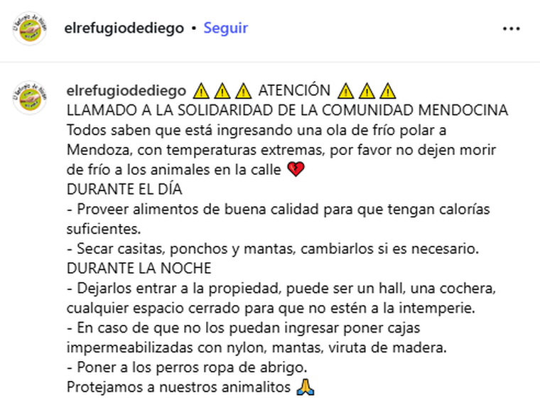Desde el municipio de Godoy Cruz, Constanza Cornejo, jefa del Departamento de Tenencia Responsable de Mascotas, hizo hincapié en las acciones básicas que puede realizar cualquier vecino: “Si no podés meter al animal a tu casa, mínimamente si pueden hacer una cuchita donde aislemos con cartón, madera y mantas, vendría muy bien. Y ni hablar si podemos prevenirles del viento con un techo o una cortina”.