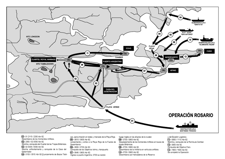 Las fuerzas armadas nacionales se presentaron en las islas el 2 de abril de 1982, en la llamada Operación Rosario. El desembarco inicial fue apoyado por una flota que incluía tecnología de vanguardia para la época y unidades de transporte pesado.