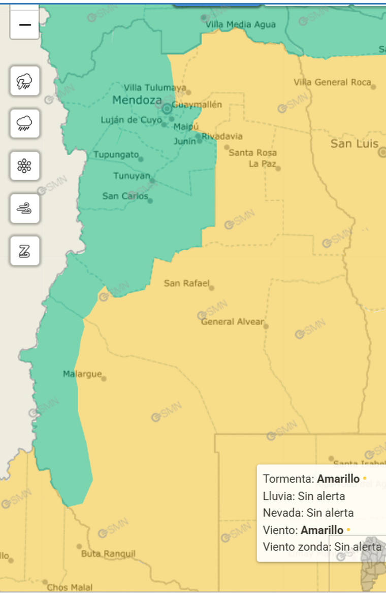 El Servicio Meteorológico Nacional emitió alertas amarillas por tormentas para distintos puntos de la provincia. En el sur mendocino, la advertencia alcanza a General Alvear y a la zona baja de San Rafael durante la franja de tarde y noche. Allí se espera un período con lluvias y tormentas de distinta intensidad, con posibilidad de que algunas se vuelvan localmente fuertes. Entre los fenómenos asociados aparecen el granizo, la fuerte actividad eléctrica y ráfagas que podrían rozar los 70 km/h.