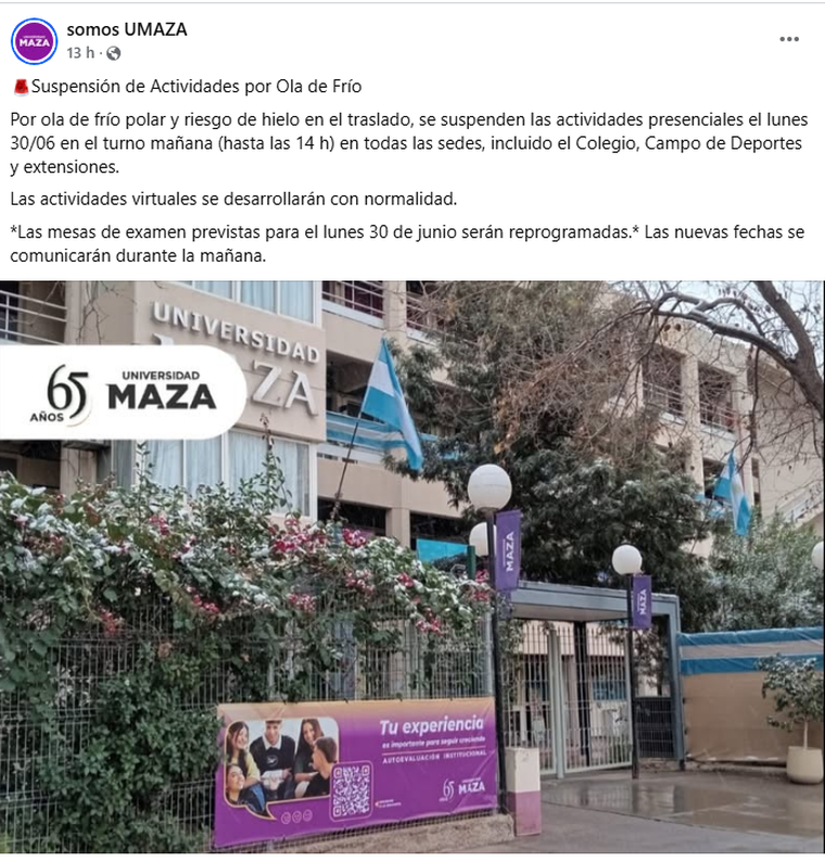 La Universidad Maza, la UNCuyo y la UTN confirmaron que por la ola de frio se suspenden las actividades presenciales este lunes en el turno mañana hasta las 14 horas. Por su parte, la Universidad de Mendoza y la Universidad de Congreso informaron que este lunes las actividades académicas y administrativas se desarrollarán con total normalidad.