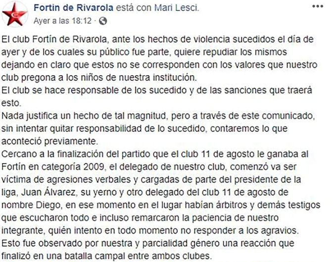 “El club Fortín de Rivarola, ante los hechos de violencia sucedidos el día de ayer y de los cuales su público fue parte, quiere repudiar los mismos dejando en claro que estos no se corresponden con los valores que nuestro club pregona a los niños de nuestra institución. El club se hace responsable de lo sucedido y de las sanciones que traerá esto", agregó el comunicado difundido por el club.