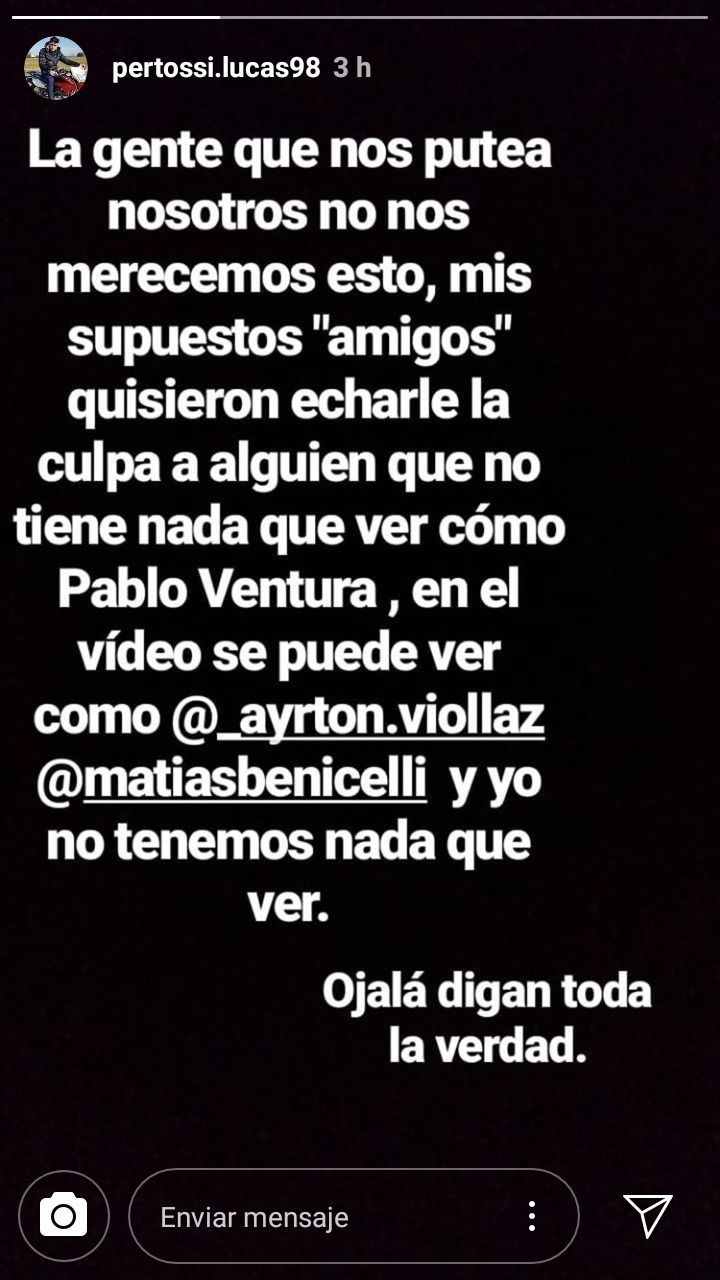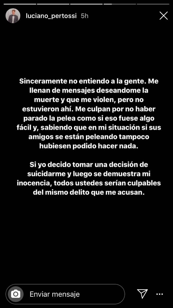 "Sinceramente no entiendo a la gente. Me llenan de mensajes deseándome la muerte y que me violen, pero no estuvieron ahí. Me culpan por no haber parado la pelea como si eso fuese algo fácil y, sabiendo que en mi situación si sus amigos se están peleando tampoco hubiera podido hacer nada", indicó Luciano Pertossi (18), uno de los apresados, a través de una historia de Instagram.