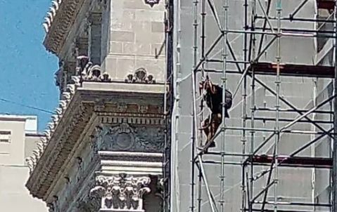 De acuerdo con los reportes, el individuo habría saltado las protecciones para luego ascender con desesperación por la estructura metálica que se ha dispuesto sobre avenida Entre Ríos a raíz de unas refacciones que se están realizando sobre la histórica fachada. Una vez arriba, decía que se iba a tirar.