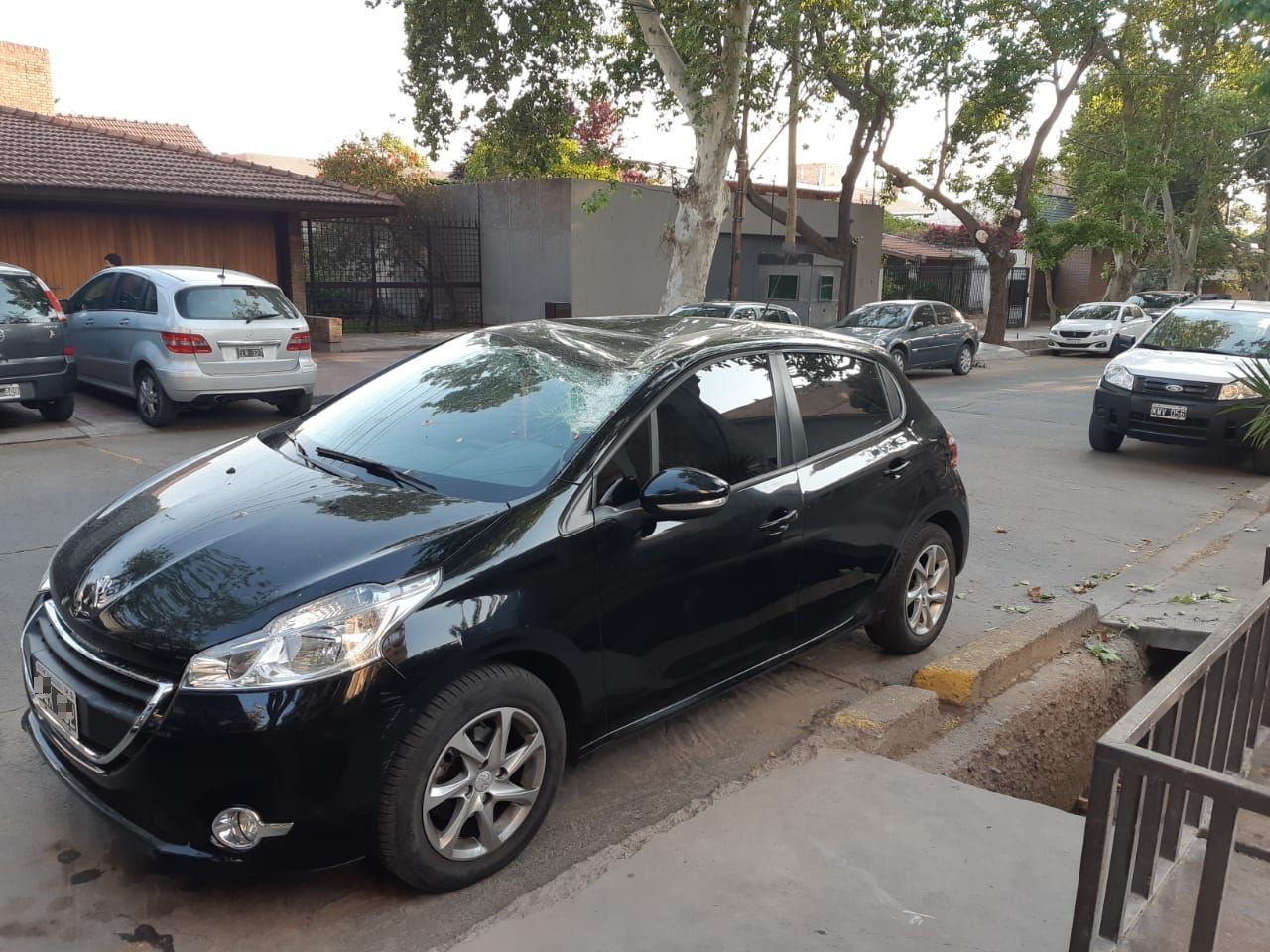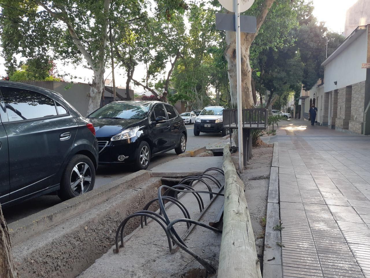 El poste cayó sobre el techo del vehículo Peugeot negro que estaba estacionado en la calle y provocó importantes daños en el rodado.