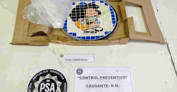 La investigación, que derivó en los arrestos de dos colombianos y un argentino, se inició el 12 de junio pasado cuando durante los controles de rutina que la PSA realiza en la Terminal de Cargas Argentinas del Aeropuerto Internacional de Ezeiza se detectó una encomienda que iba a Holanda y que contenía una artesanía similar a un plato, realizada con pequeños azulejos o venecitas que formaban la imagen de Mafalda, el personaje de Quino.